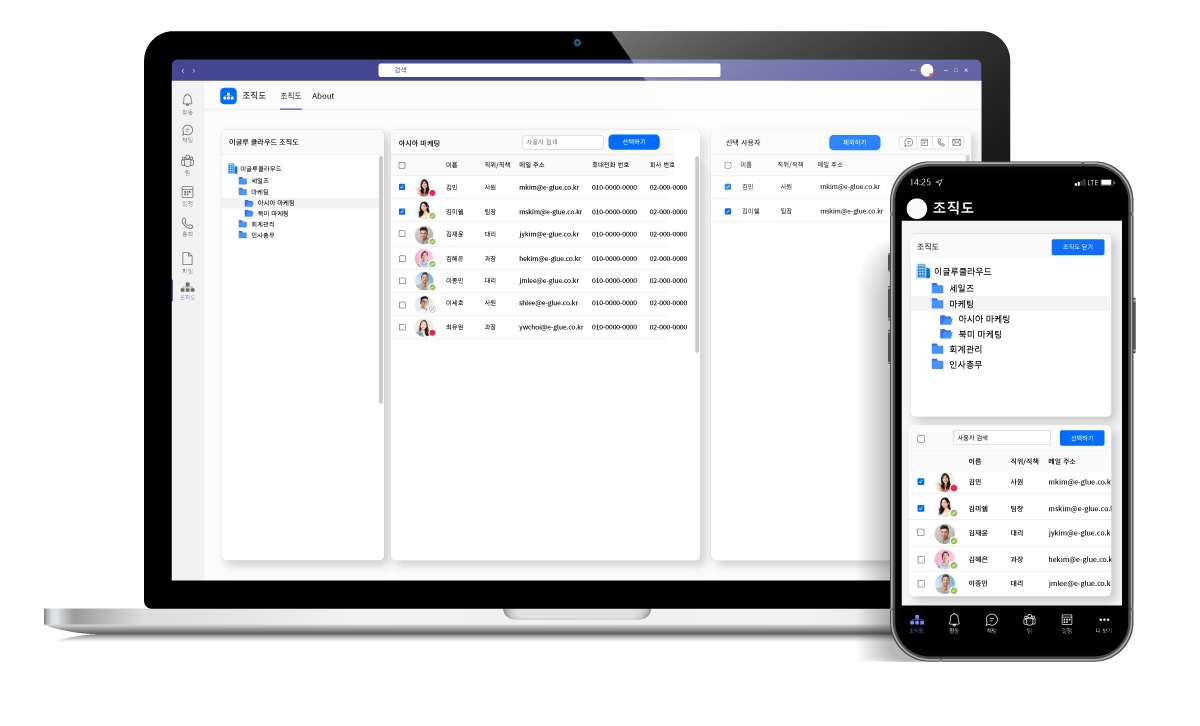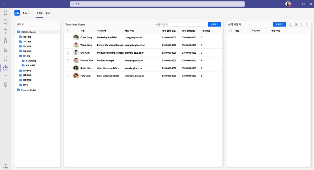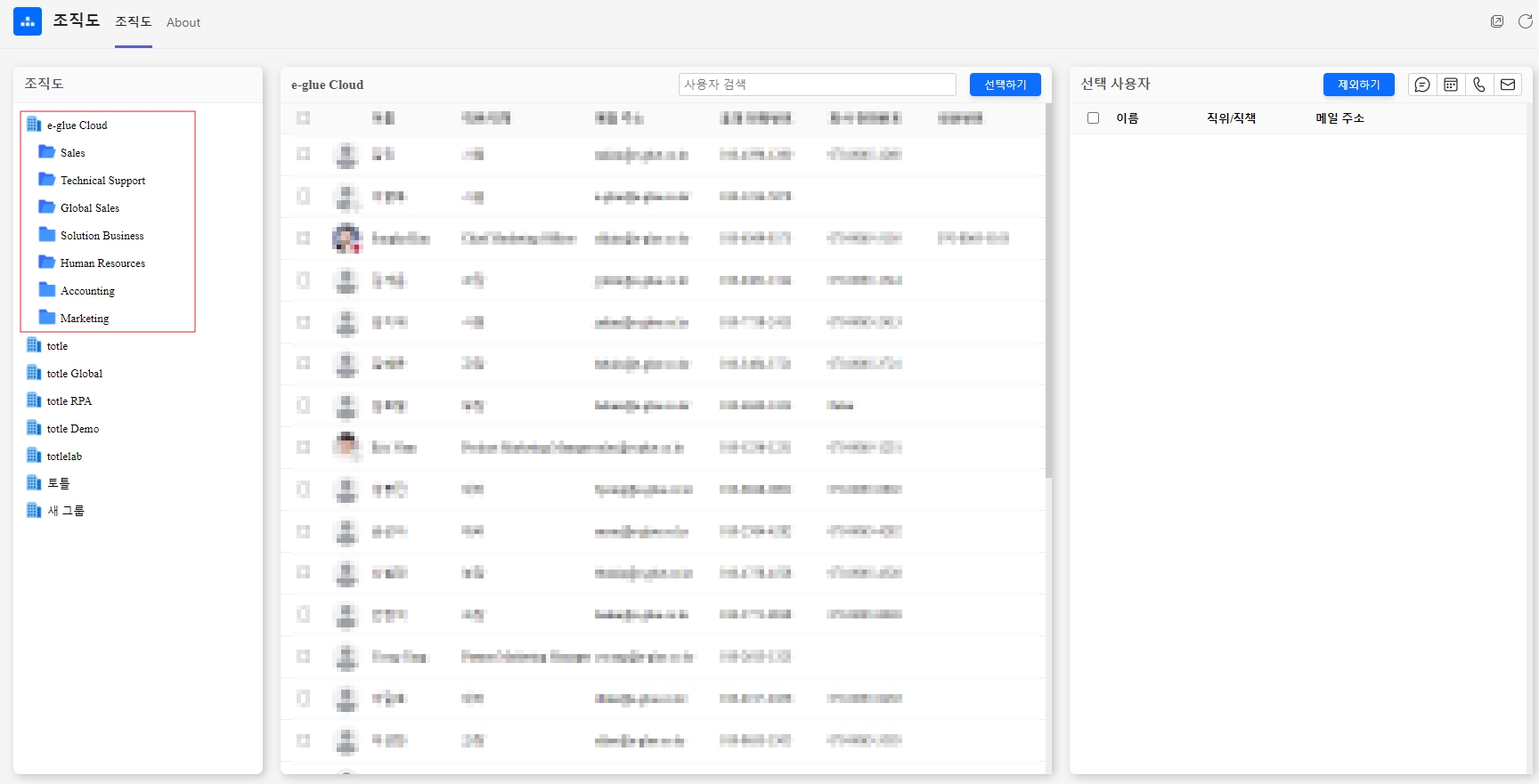 가장 좌측 섹션에서 조직 내 전체 조직도를 한 눈에 확인할 수 있습니다.