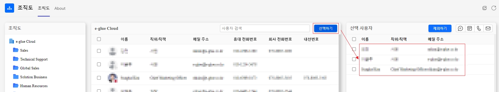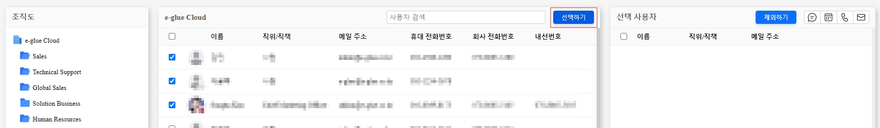 선택하기를 클릭하면 우측에 위치한 선택 사용자 섹션으로 선택 사용자가 이동하게 됩니다.