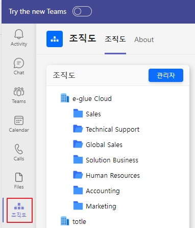 사전 설정이 완료되면 Microsoft Teams 좌측 메뉴바에서 조직도 아이콘을 확인할 수 있습니다.