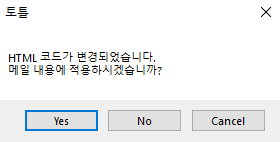 HTML 소스 보기를 클릭하면 HTML 코드 변경 및 적용 확인 팝업창이 나타납니다.