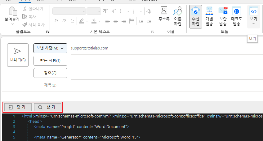 아웃룩에서 전송하려고 하는 이메일의 HTML 코드를 전체 복사합니다.