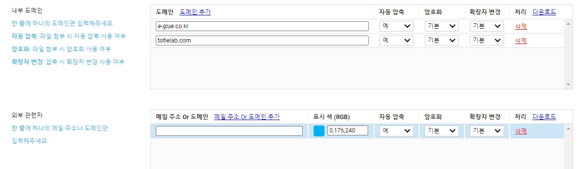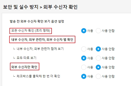 이 설정은 관리자 도구에서 얼마든지 체크박스 체크 혹은 해제를 통해 활성화 하고 비활성화 할 수 있습니다. 기업에서 설정한 이메일 정책에 따라 커스터마이징해 활용할 수 있습니다. (ex: 내/외부 분리 알림창만을 활성화 해 활용)