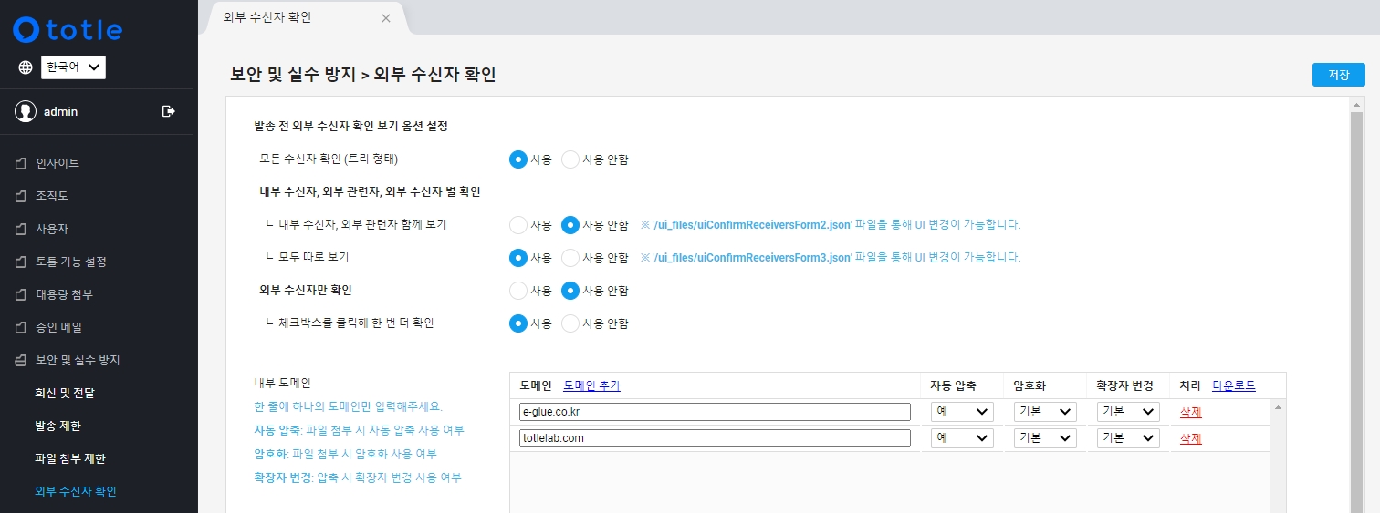 관리자 페이지 > 좌측 메뉴 > 보안 및 실수 방지 > 외부 수신자 확인에 들어갑니다.