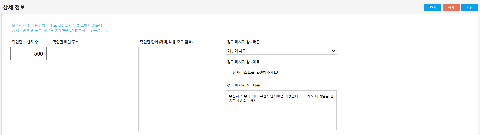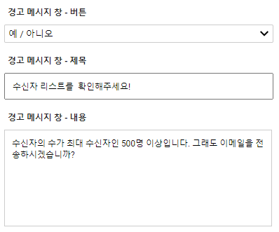 ex) 500명으로 설정한 경우 발송하는 수신자의 수가 500명 이상인 경우 경고 창이 나타납니다.