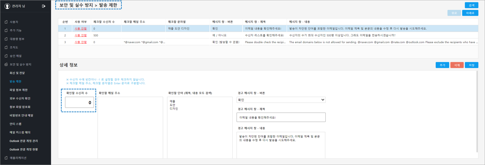 이메일 발송 시 제목 혹은 메일 본문에 특정 단어가 포함된 경우 이메일 발송을 제한하거나 경고 메시지 창을 띄울 수 있습니다.