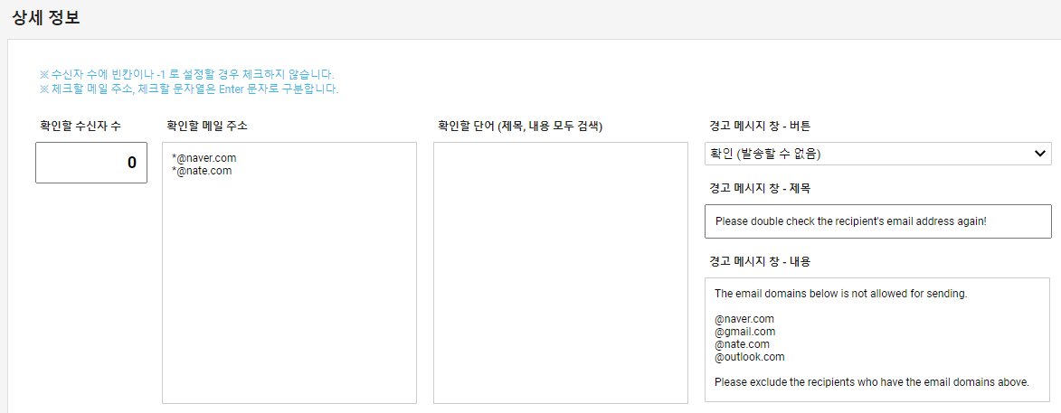 특정 이메일 주소: 이메일 발송 시 특정 이메일 주소가 포함되어 있는 경우 발송을 제한하거나 경고 메시지 창을 띄울 수 있습니다. ex) [email protected], [email protected]
