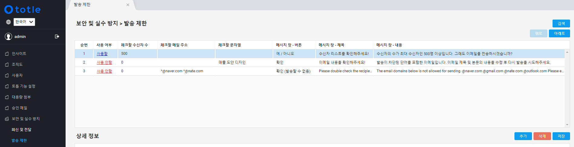 발송제한을 해제하고자 하는 경우에는 사용 여부 열에서 사용함에 클릭하면 사용 안함으로 변경됩니다.