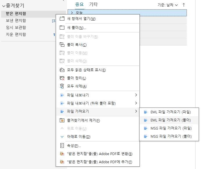 예: EML 파일을 가져오고자 한다면 EML 파일 가져오기 (파일)을 클릭합니다.